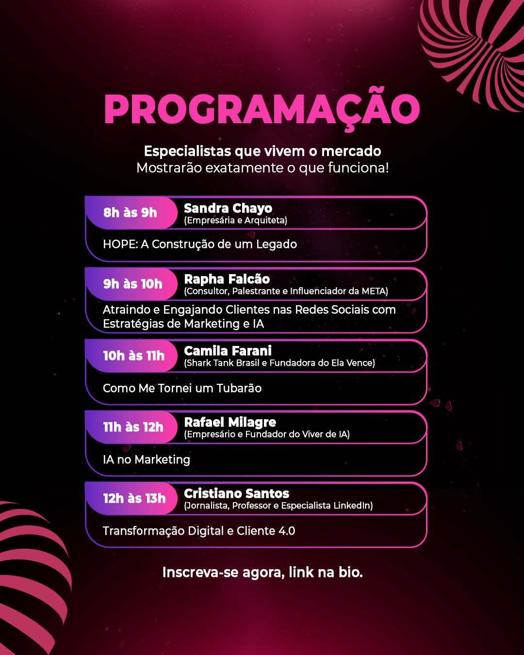 A programação foi estruturada para apresentar, de forma prática, estratégias e tendências que impactam diretamente o desempenho dos negócios no ambiente digital. Às 9h, a empresária e arquiteta Sandra Chayo abre o evento com a palestra “HOPE: A Construção de um Legado”, na qual compartilha sua experiência na construção e consolidação de marca, com foco em visão estratégica e posicionamento.